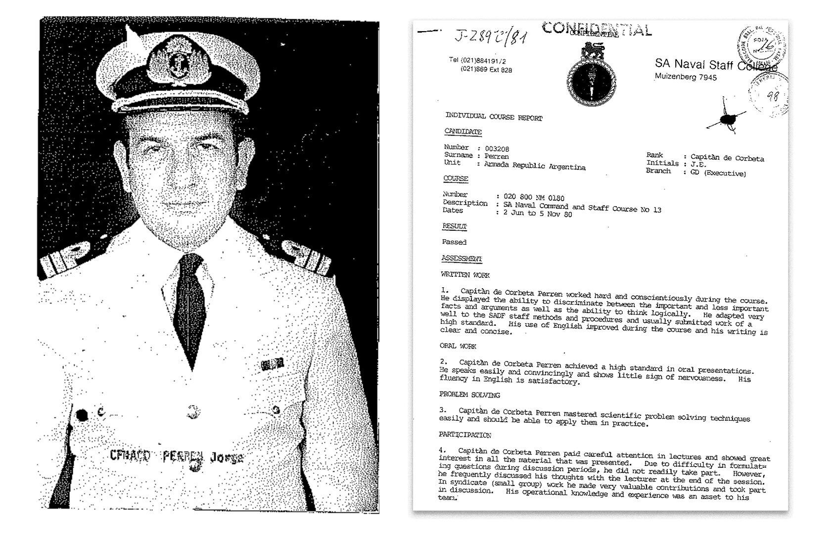 Jorge Acosta y Jorge Perren llegan a Ciudad del Cabo en la primera mitad de 1980. No se sabe el momento exacto porque en sus legajos las fechas de llegada fueron enmendadas a mano. El primer indicio fiable de su presencia en Sudáfrica data de junio de 1980: en los legajos se adjuntan dos informes de calificaciones firmados por un oficial sudafricano sobre la participación de Acosta y Perren en un curso de comando naval en la Escuela de Estado Mayor de la Armada de Sudáfrica, conocida por su nombre en inglés, South African Naval Staff College, donde marinos sudafricanos reciben instrucción en estrategia y liderazgo para acceder a puestos de mando. La Escuela también suele recibir a oficiales extranjeros que toman cursos por algunos meses.